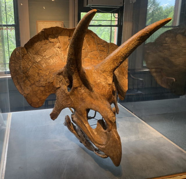 I drove back to Dad’s Sunday night, while Debbi went to stay with her sister. Debbi had another friend drive up with his daughter and her friend (both teenagers) on Monday to stay the night, and it sounds like they had fun. Meanwhile Dad and I went to the Harvard Museum of Natural History, which we’d last visited a decade or more ago. They’ve updated a lot of the exhibits since last we were there and it looks a lot spiffier, although it’s somehow comforting that the room with the dinosaur fossils and the coelacanth seem to only have received a fresh coat of paint. (Technically this is the Romer Hall of Vertebrate Paleontology.)